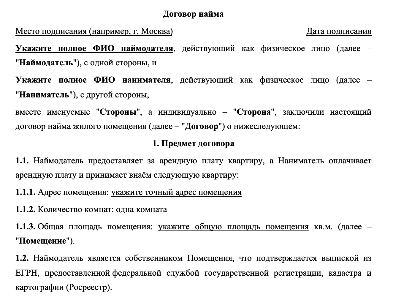 Самое важное: точный адрес жилого помещения, срок найма, размер арендной платы и достоверные данные о сторонах.