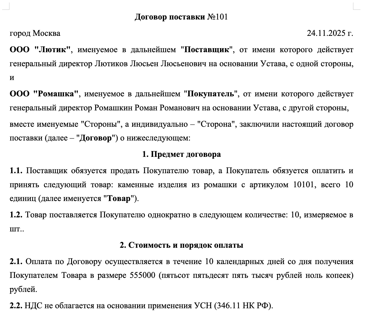 Укажите наименование для автоматического заполненияname2, именуемое в дальнейшем "Поставщик", от имени которого действует генеральный директорosnova_postavka3 укажите ФИО полностьюname21 на основании Уставаosnova_postavka4, с одной стороны, и