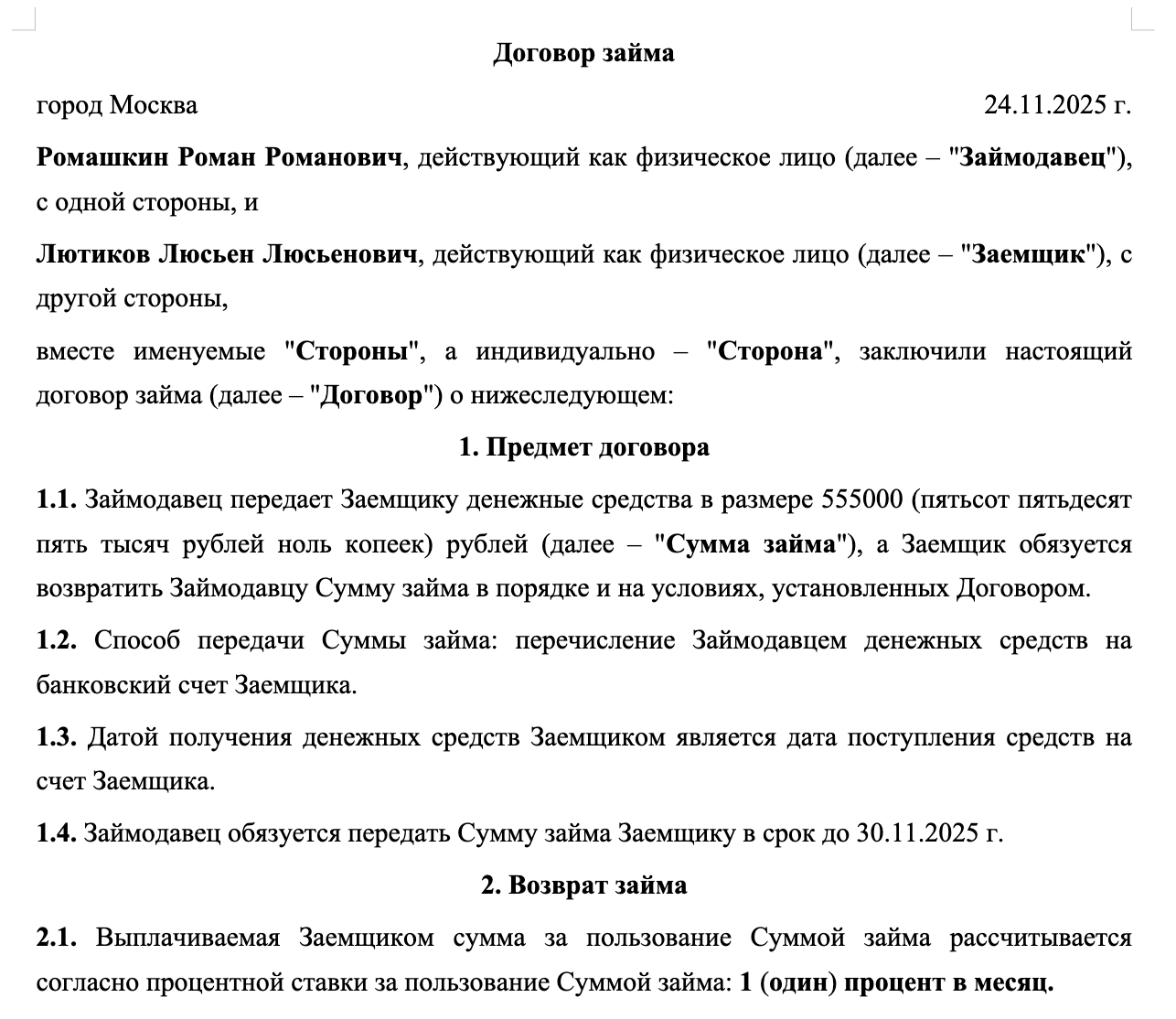 Данный шаблон договора предусмотрен для займов между физическими лицами для личных (не предпринимательских) целей.