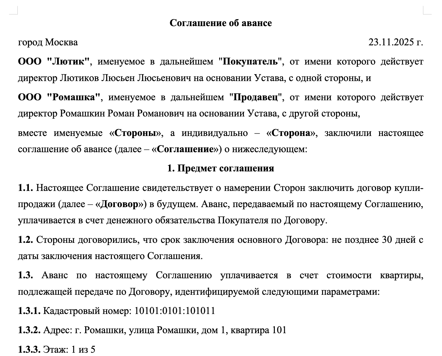 1.1. В соответствии с настоящим Соглашением Покупатель уплачивает Продавцу аванс на сумму укажите сумму цифрамиsumma рублей.